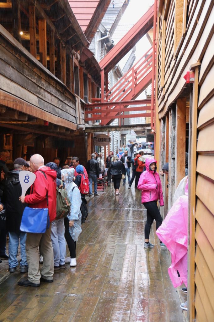 Det blev på grund av vädret ingen allvarligare utforskning av Bergen utan vi fick endast koncentrera oss på det stora turistmålet, Bryggen. Det är en massa gamla trähus byggda av tyskar på medeltiden när de handlade med torkad torsk från Lofoten.