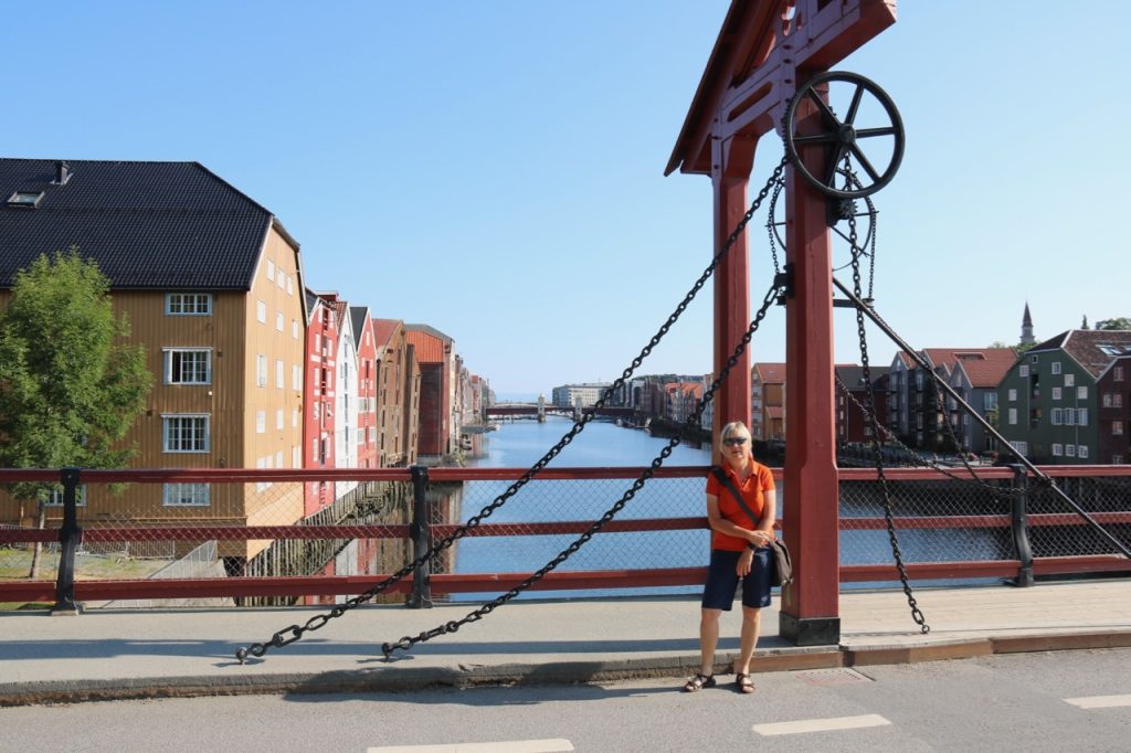 Idag har vi tagit det lite lugnare än de tidigare dagarna, även om morgonen blev något tidig. Vi anländer till ett soligt Trondheim kl. 08:30 så för att hinna med frukost innan vi ger oss av ut på stan så måste vi upp kl. 7. Vi står i kön för att gå i land när fartyget angör bryggan och ger oss direkt ut på byn när bryggan är nedfälld. Vi har nu tre och en halvtimme på oss innan fartyget avgår igen. Vi promenerar iväg i hettan in mot stan. Det är en lite tråkig promenadväg en bit först genom hamnområdet och över järnvägsstation innan vi kommer in till själva stan. Väl där så letar vi oss ned till Nidälva och de äldre lagerbyggningarna som finns utmed älva. De är fina och pampiga på ett annat sätt jämfört med Bryggen i Bergen även om dessa hus inte är så gamla som Bryggen. Så småningom kommer vi fram till den gamla Bybroen. En söt och fin bro över älven, den är säkert jättegammal.