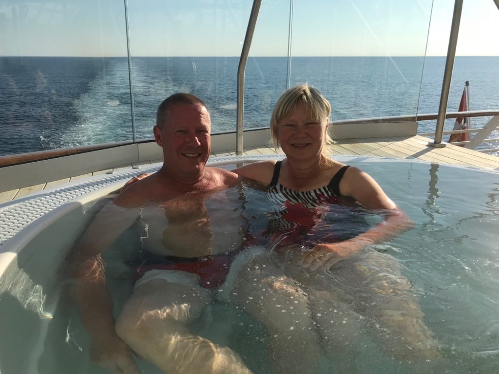 Nu får vi vänta en stund på lunchen eftersom vi har sen middag ikväll så får vi också sen lunch. Eftermiddagen tillbringar vi med att sova en stund på akterdäcket samt att sitta framme i förbaren och blogga, hantera foton, maila med mera. Innan det blir middag inser vi att vi kan hinna med att ta ett Jacuzzibad, också på akterdäck med en fantastisk utsikt över kustlinjen åt ena hållet och det öppna havet åt andra hållet eftersom vi nu har kommit ut på öppet hav.