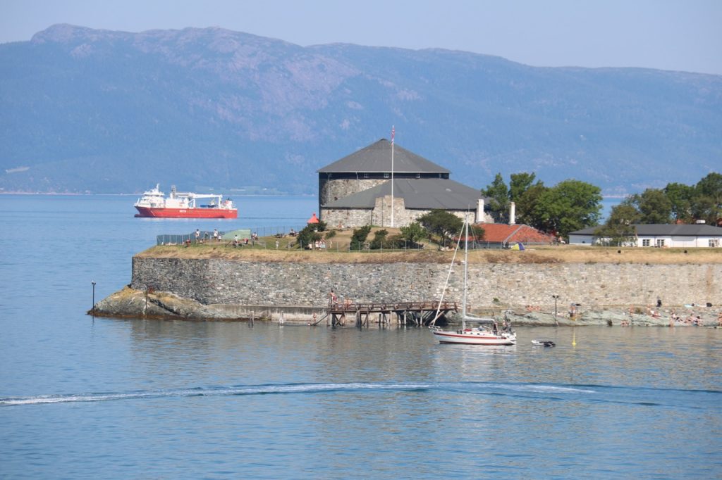 Efter besöket i Katedralen går vi nedåt torget, vilket visar sig vara en stor besvikelse den här sommaren. Hela torget verkar uppgrävt på grund av något arbete med några rör eller så som måste dras över torget. I och med det, men också kanske beroende på värmen, så känns hela det centrala Trondheim väldigt avslaget denna fredagsförmiddag. Men vi hittar tillslut i alla fall den central gågatan med alla butiker. Vi får oss en glass innan vi strosar tillbaka till fartyget. Vi hann innan fartyget avgick igen. På vägen ut ifrån hamnen så passerar vi Munkholmen, en liten ö, populärt utflyktsmål med badmöjligheter, i Trondheimsfjorden. Den har använts till och från sedan vikingatiden, bland annat av munkar och nu används den av ett bryggeri som brygger en alkoholfri öl.